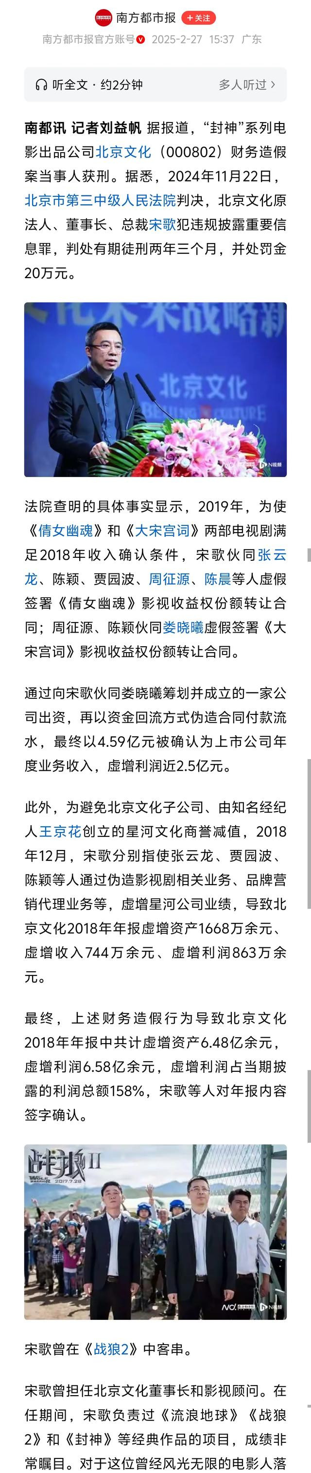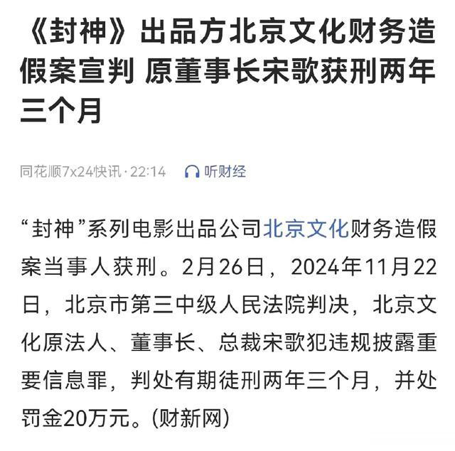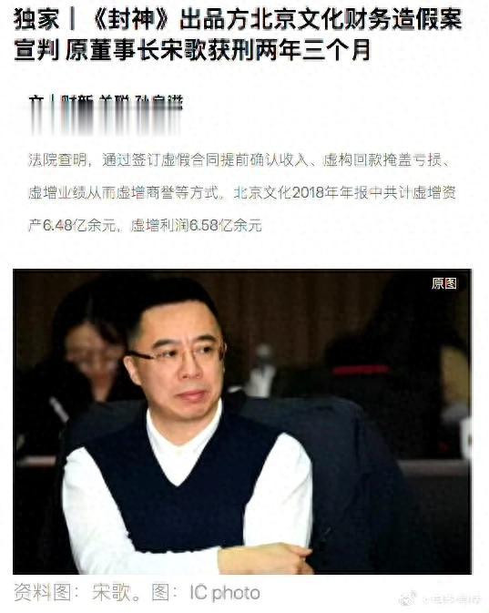 有媒体报道,《封神》系列出品人北京文化董事长宋歌因财务造假,虚增资产6.48亿、利润6.58亿多被判刑两年三个月,处罚金20万。